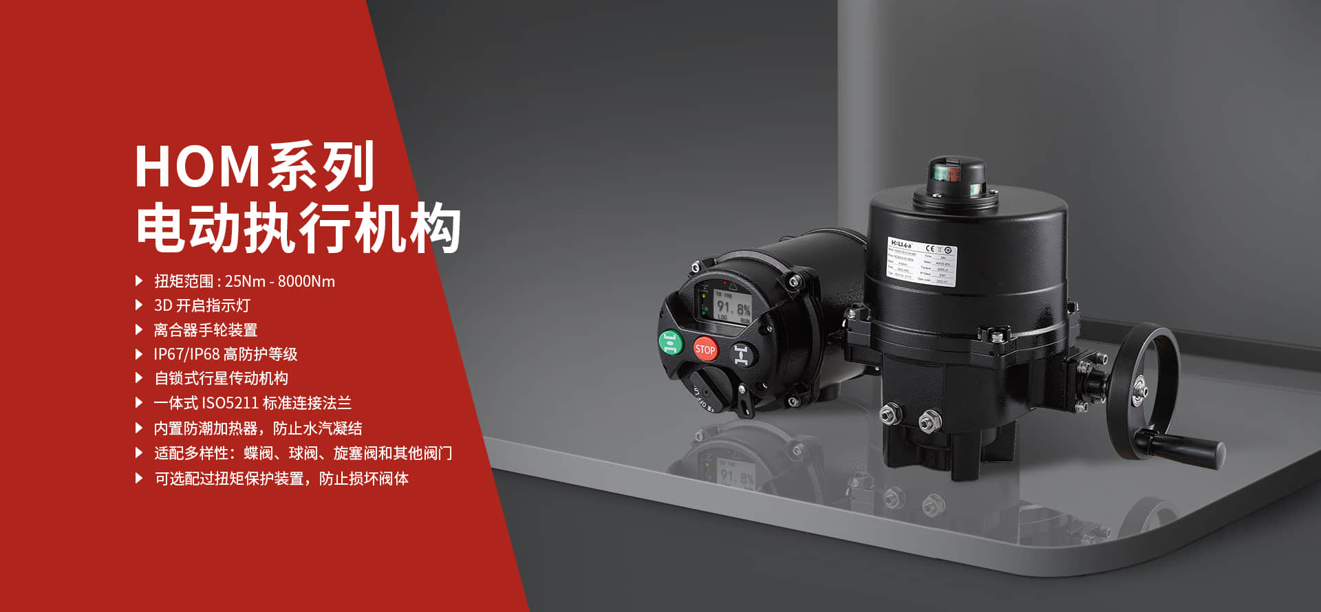 HOM系列帶行星齒輪的部分回轉電動執行機構,用于機械傳動。輸出扭矩為25~8000NM,無離合器手動操作。手動和電動分別操作。它在沒有手柄或離合器的情況下很容易操作,當電源打開時,你可以轉動手輪。電動執行機構可與蝶閥、球閥、旋塞閥組合,廣泛應用于發電廠/冶金廠/污水處理廠/樓宇自動化/城市管網等管道系統